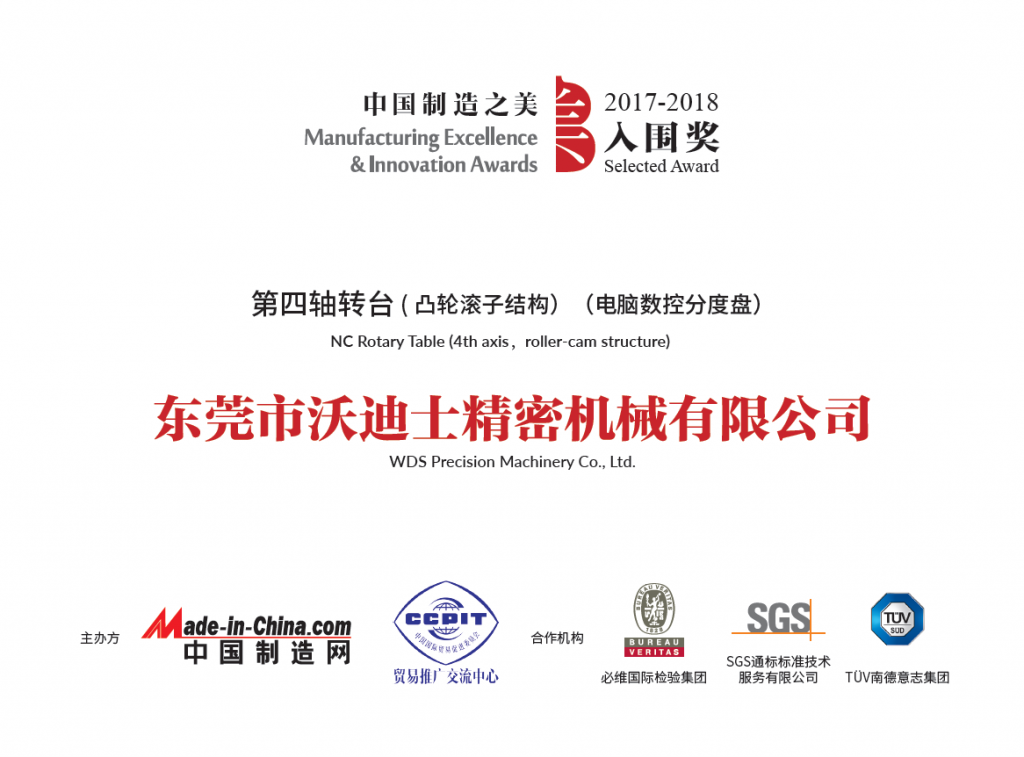 沃迪士參賽產(chǎn)品(第四軸轉(zhuǎn)臺(tái) (凸輪滾子結(jié)構(gòu))(電腦數(shù)控分度盤(pán)))經(jīng)過(guò)初評(píng)、終評(píng)兩輪評(píng)選,從中國(guó)制造之美2017屆13個(gè)參賽組別4309件參賽產(chǎn)品中脫穎而出,榮獲2017“中國(guó)制造之美”年度評(píng)選 工業(yè)設(shè)備及組件 類(lèi) 入圍獎(jiǎng)!并將獲得由活動(dòng)主辦方中國(guó)制造網(wǎng)、貿(mào)促會(huì)貿(mào)推中心,聯(lián)合國(guó)際三大知名認(rèn)證機(jī)構(gòu)SGS、BV、 TüV南德頒發(fā)的榮譽(yù)獎(jiǎng)牌。