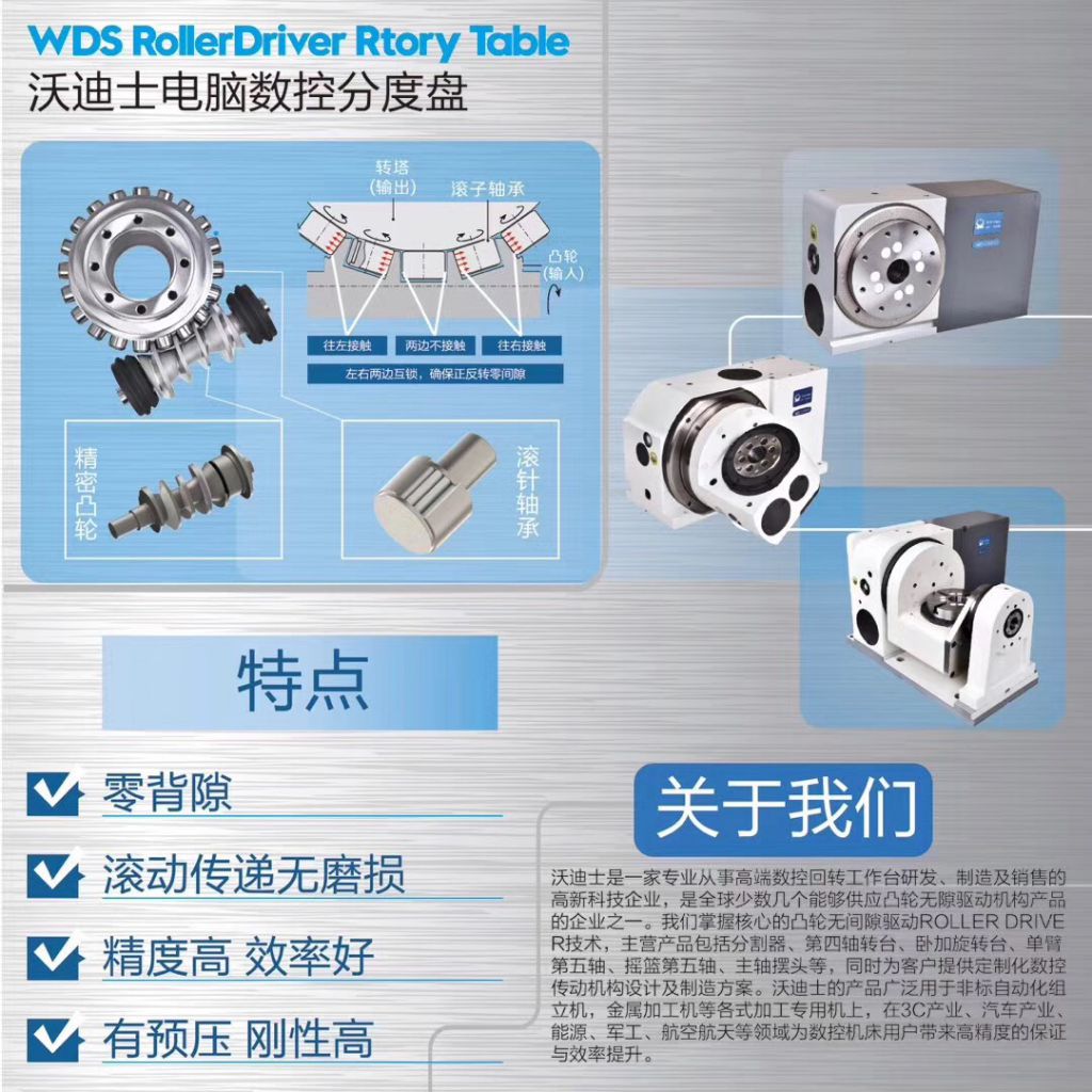 7. 2016年,沃迪士WDS成功推出成功研發(fā)單臂式及搖籃式五軸數(shù)控分度盤產(chǎn)品,與機床廠商合作開發(fā)數(shù)控擺頭。