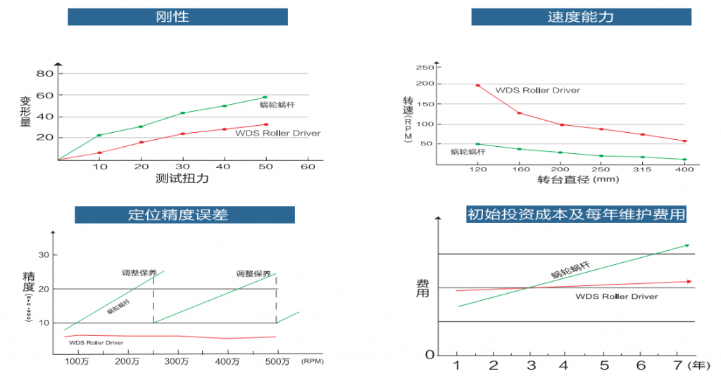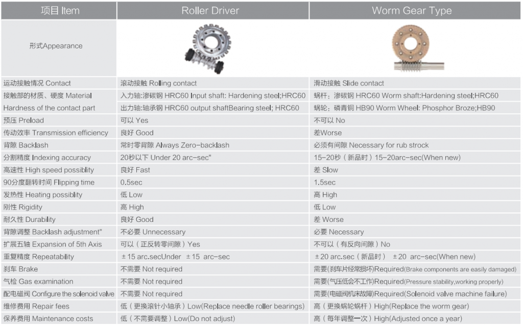 目前市場上的轉(zhuǎn)臺產(chǎn)品以蝸輪蝸桿結(jié)構(gòu)為主。渦輪材料為磷青銅,無法加預(yù)壓,剛性差,隨著使用磨損整個轉(zhuǎn)臺精度不斷下降,導(dǎo)致極高的后期維修成本,給機(jī)床用戶及代理商都帶來很多困擾和經(jīng)濟(jì)損失。要規(guī)避蝸輪蝸桿結(jié)構(gòu)的缺點(diǎn),蝸輪蝸桿的材料需要特殊處理(如日研、雷曼等高端品牌),但價格昂貴,一般客戶無力承擔(dān)。